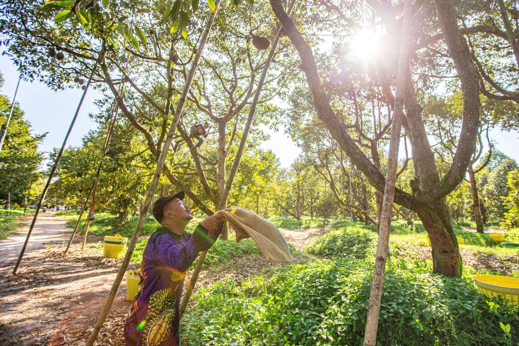 The harvest unfolds with choreographed precision. Agile climbers scale the towering trees, their curved knives flashing as they sever the stems of ripe durians. Below, partners stand ready with outstretched cloth, catching the falling fruits with muffled thuds -- each successful catch preserving a precious cargo. This generations-old technique ensures every durian arrives at markets in perfect condition.