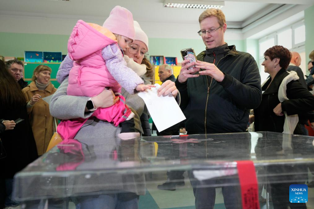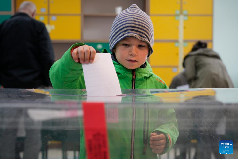 A boy casts a ballot on behalf of his parent at a polling station in Warsaw, Poland, on May 18, 2025. No candidate secured more than 50 percent of vote in the first round of Poland's presidential election on Sunday, according to exit polls.