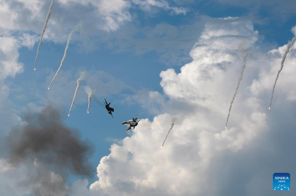 Aircraft perform an aerobatic show at the opening ceremony of the 17th edition of the Langkawi International Maritime and Aerospace Exhibition (LIMA) in Langkawi, Malaysia, May 20, 2025. The 17th edition of the Langkawi International Maritime and Aerospace Exhibition (LIMA) kicked off here on Tuesday, with defense and associated companies from around the globe eyeing a higher profile in Asia's defense sector. (Xinhua/Ma Ping)