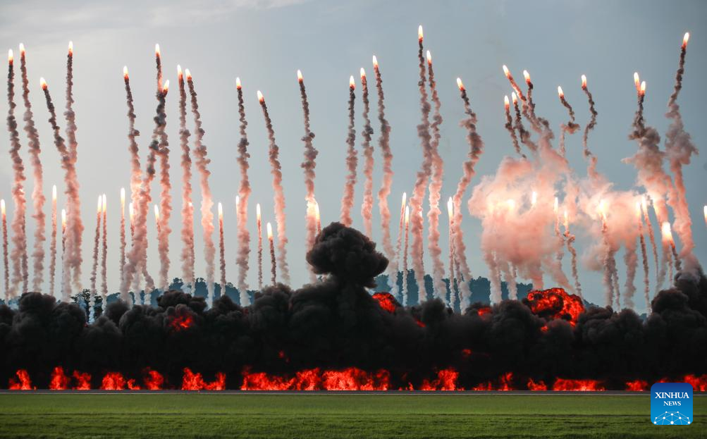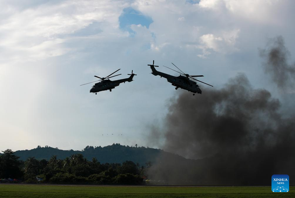 This photo shows a bombardment simulation at the opening ceremony of the 17th edition of the Langkawi International Maritime and Aerospace Exhibition (LIMA) in Langkawi, Malaysia, May 20, 2025. The 17th edition of the Langkawi International Maritime and Aerospace Exhibition (LIMA) kicked off here on Tuesday, with defense and associated companies from around the globe eyeing a higher profile in Asia's defense sector.(Xinhua/Ma Ping)