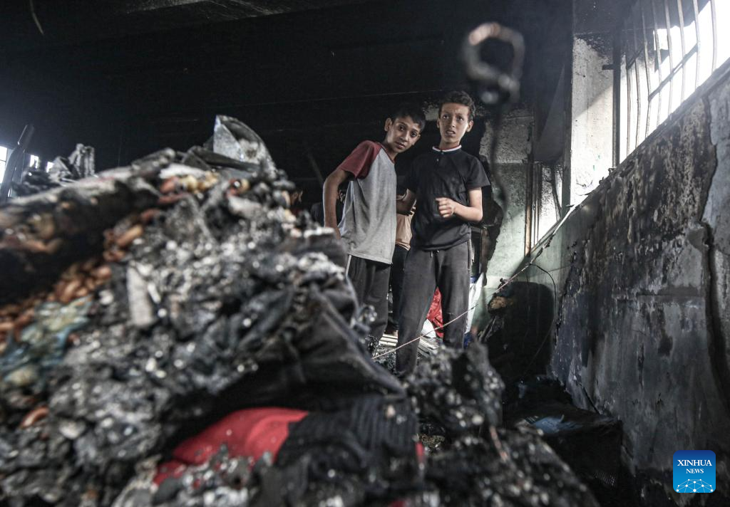 Palestinians check damage after an Israeli airstrike on a school that shelters displaced people, in Gaza City, May 20, 2025. At least 64 Palestinians were killed in Israeli attacks across Gaza on Tuesday, said Mahmoud Basal, spokesperson for the Civil Defense in Gaza. (Photo by Mahmoud Zaki/Xinhua)