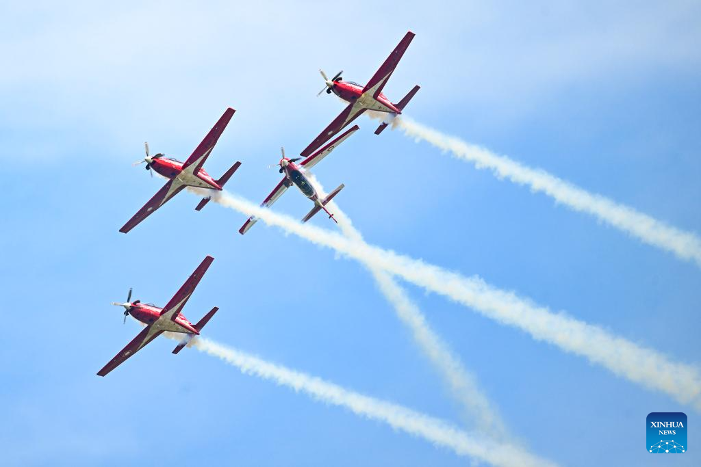 Jupiter Aerobatic Team performs an aerobatic show at the opening ceremony of the 17th edition of the Langkawi International Maritime and Aerospace Exhibition (LIMA) in Langkawi, Malaysia, May 20, 2025. (Xinhua/Ma Ping)
