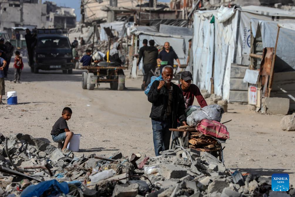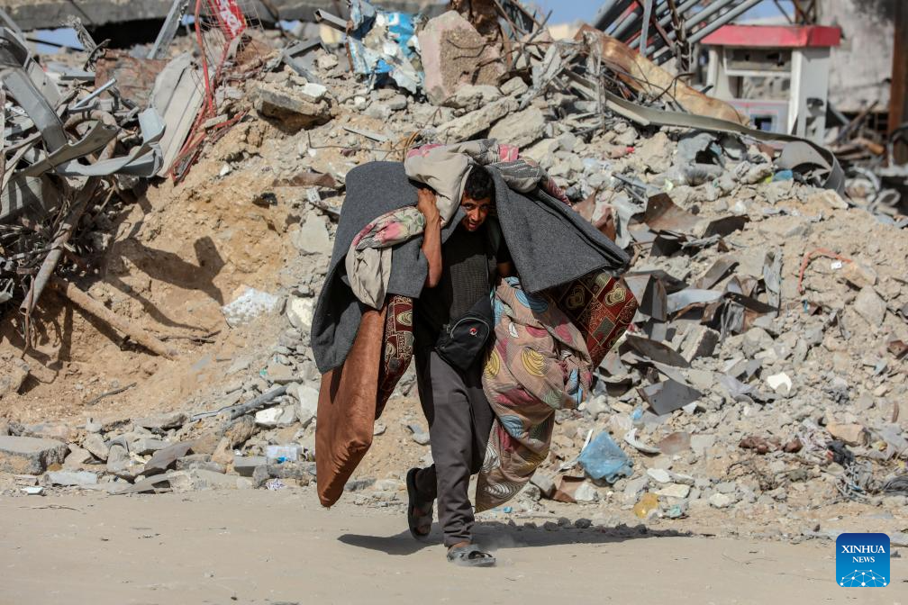 A Palestinian, carrying his belongings and fleeing the towns of Beit Lahia and Jabalia in the northern Gaza Strip to the center and west of Gaza City after the Israeli displacement orders, is seen in the Jabalia area, the Gaza Strip, May 19, 2025. (Photo by Rizek Abdeljawad/Xinhua)
