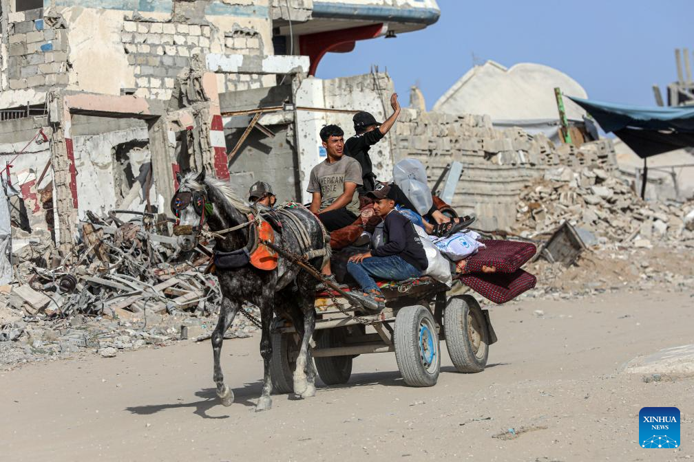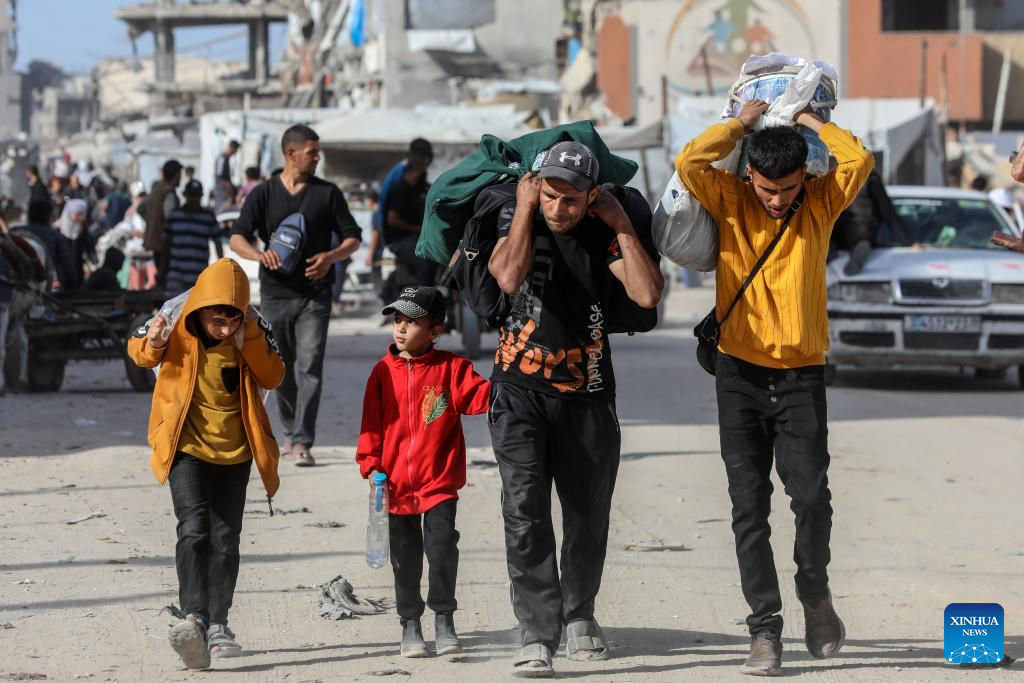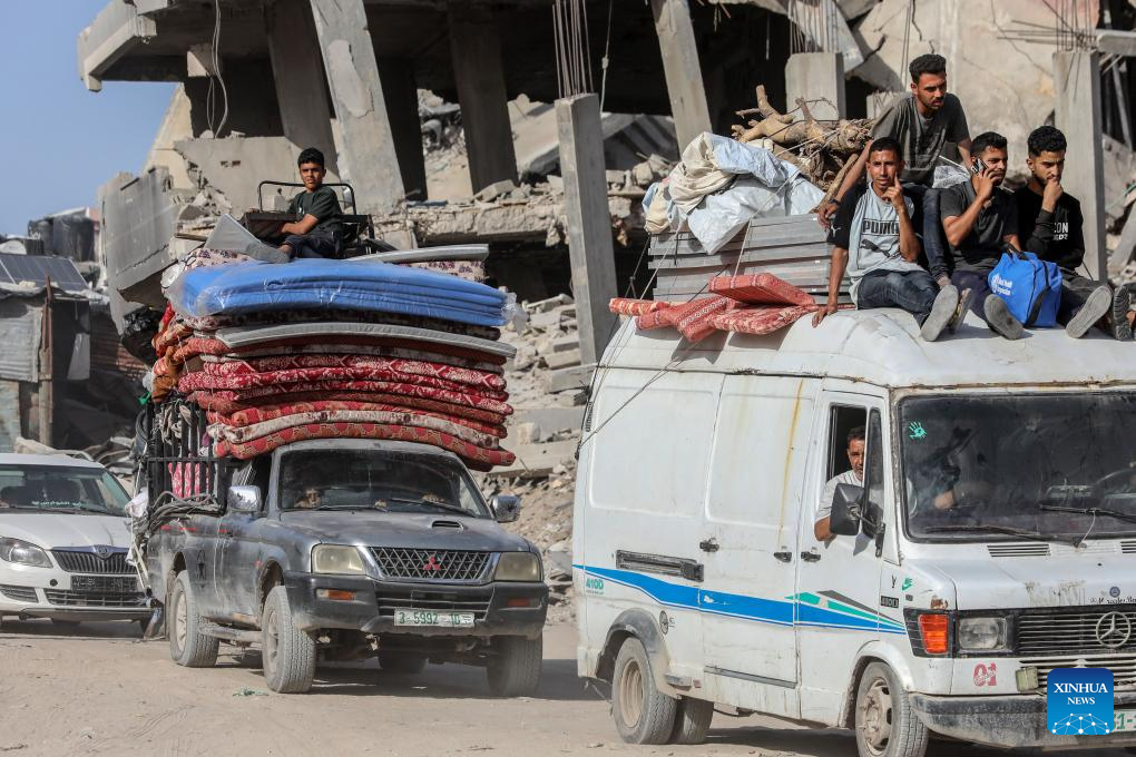 Palestinians, carrying their belongings and fleeing the towns of Beit Lahia and Jabalia in the northern Gaza Strip to the center and west of Gaza City after the Israeli displacement orders, are seen in the Jabalia area, the Gaza Strip, May 19, 2025. (Photo by Rizek Abdeljawad/Xinhua)