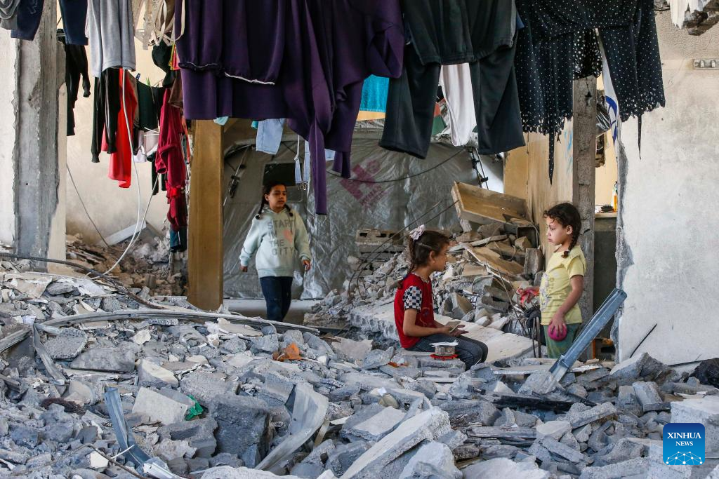 Displaced Palestinian children are pictured at a temporary shelter in Jabalia refugee camp, northern Gaza Strip, on May 20, 2025. More than 28,000 women and girls have been killed in Gaza since the beginning of the war in Gaza in October 2023, according to UN Women. (Photo by Mahmoud Zaki/Xinhua)