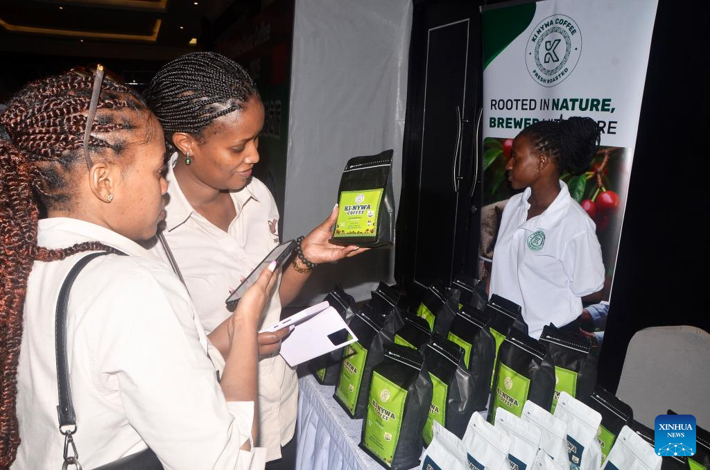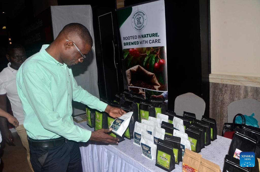 A visitor learns about a coffee product during the Uganda-China Coffee Trade and Investment Conference in Kampala, Uganda, on May 20, 2025. A delegation of Chinese investors is touring Uganda to establish business ties with local coffee farmers, as demand for the cash crop surges in China's rapidly expanding market.(Photo by Nicholas Kajoba/Xinhua)