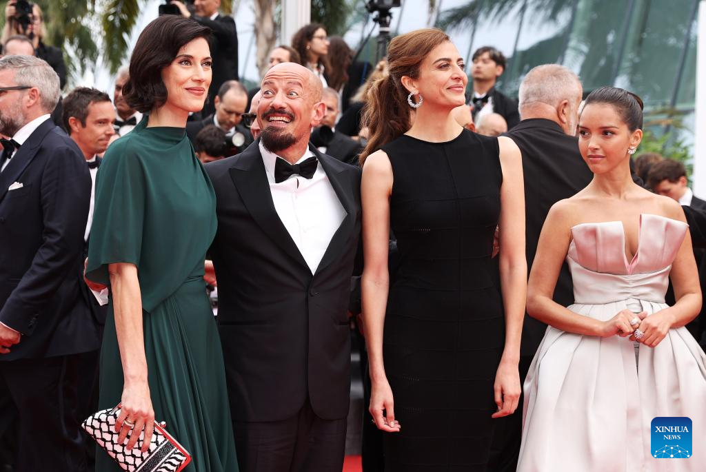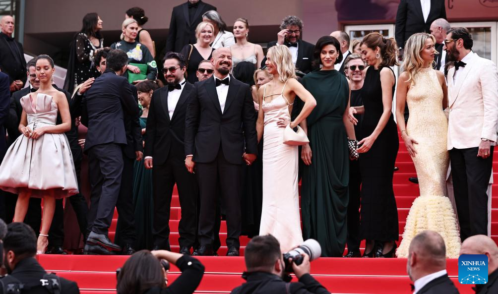Swedish director Tarik Saleh (2nd R, front) leaves with cast members after the screening of the film "Eagles of the Republic" at the 78th edition of the Cannes Film Festival in Cannes, southern France, on May 19, 2025. (Xinhua/Gao Jing)