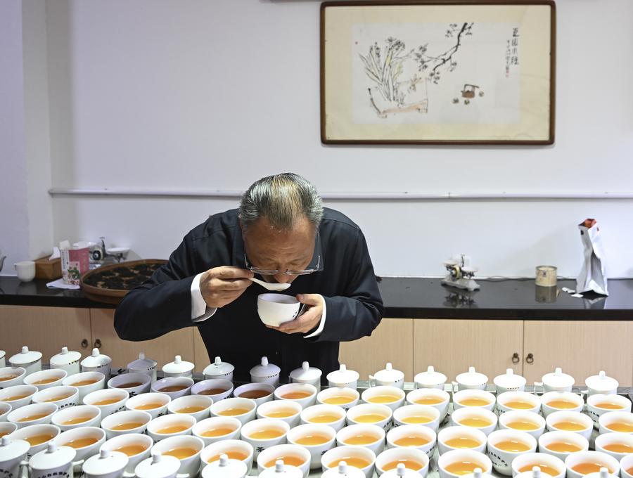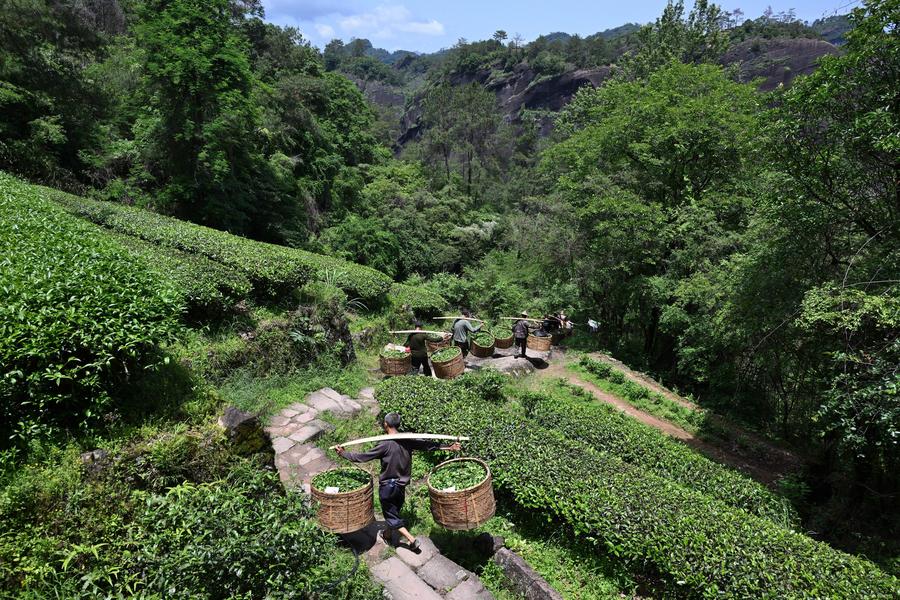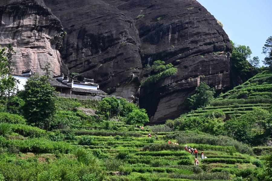 An aerial drone photo shows a panoramic view of Tongmu Village of Wuyishan, southeast China's Fujian Province, May 9, 2025. (Xinhua/Jiang Kehong)Liu Feng (2nd R), an inheritor of Wuyi rock tea making technique, airs tea leaves with farmers in Wuyishan, southeast China's Fujian Province, May 2, 2025. (Photo by Qiu Ruquan/Xinhua)Students learn tea art at a vocational secondary school in Wuyishan, southeast China's Fujian Province, May 8, 2025. (Xinhua/Jiang Kehong)You Yuqiong, an inheritor of Wuyi rock tea making technique, roasts tea leaves in Wuyishan, southeast China's Fujian Province, May 7, 2025. (Xinhua/Jiang Kehong)People enjoy tea in Wuyishan, southeast China's Fujian Province, May 7, 2025. (Xinhua/Jiang Kehong)A tea technician instructs her son to process tea leaves in Wuyishan, southeast China's Fujian Province, May 6, 2025. (Xinhua/Jiang Kehong)An aerial drone photo shows a tea garden in Qiyun Peak scenic spot in Wuyishan, southeast China's Fujian Province, May 8, 2025. (Xinhua/Jiang Kehong)Students learn tea art at a vocational secondary school in Wuyishan, southeast China's Fujian Province, May 8, 2025. (Xinhua/Jiang Kehong)Farmers carry newly-picked tea leaves in Tongmu Village of Wuyishan, southeast China's Fujian Province, May 9, 2025. (Xinhua/Wang Huajuan)Farmers head for a tea garden to pick tea leaves in Wuyishan, southeast China's Fujian Province, May 6, 2025. (Xinhua/Jiang Kehong)You Yuqiong, an inheritor of Wuyi rock tea making technique, kneads tea leaves in Wuyishan, southeast China's Fujian Province, May 7, 2025. (Xinhua/Jiang Kehong)Tourists try picking tea leaves in Wuyishan, southeast China's Fujian Province, May 7, 2025. (Photo by Chen Ying/Xinhua)A drone transports tea leaves at a tea garden in Wuyishan, southeast China's Fujian Province, May 6, 2025. (Xinhua/Jiang Kehong)Workers shoulder newly-picked tea leaves in Wuyishan, southeast China's Fujian Province, May 6, 2025. (Xinhua/Jiang Kehong)A tea cooperative founder judges newly-brewed tea in Wuyishan, southeast China's Fujian Province, May 9, 2025. (Xinhua/Jiang Kehong)You Yuqiong, an inheritor of Wuyi rock tea making technique, processes tea leaves in Wuyishan, southeast China's Fujian Province, May 7, 2025. (Xinhua/Jiang Kehong)■