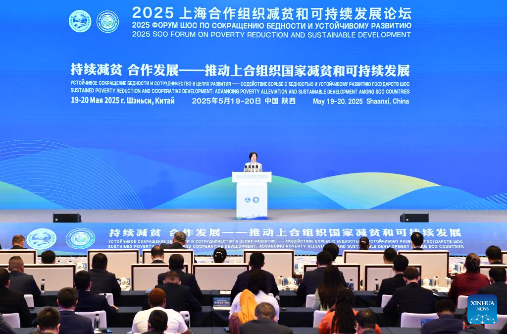The 2025 SCO (the Shanghai Cooperation Organization) Forum on Poverty Reduction and Sustainable Development is opened in Xi'an, northwest China's Shaanxi Province, May 20, 2025. Shen Yueyue, vice chairperson of the National Committee of the Chinese People's Political Consultative Conference and chairperson of the Good-Neighborliness, Friendship and Cooperation Commission of the SCO, read out Chinese President Xi Jinping's congratulatory letter and delivered a keynote speech. (Xinhua/Shao Rui)