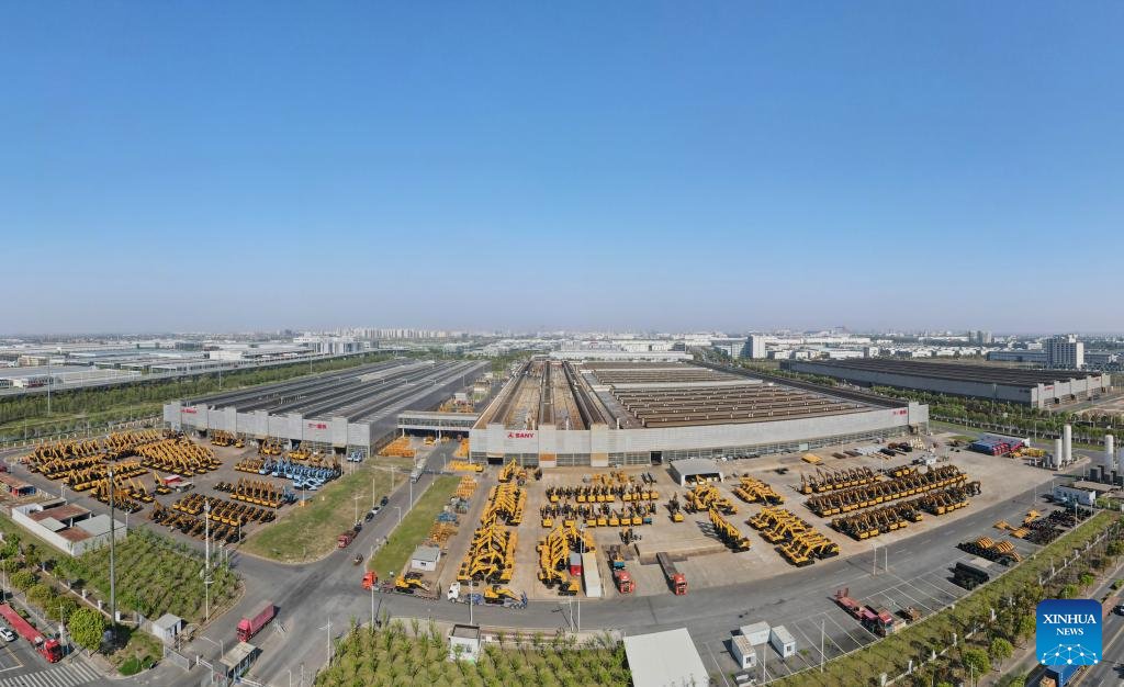An aerial drone photo taken on April 15, 2025 shows the exterior view of Shanghai Sany Heavy Machinery Co., LTD. in Shanghai, east China, April 15, 2025. Taking manufacturing as the city's important support for core competitiveness, Shanghai is now vigorously developing advanced manufacturing industry, including heavy machinery manufacturing, intelligent manufacturing, clean energy manufacturing, intelligent robot and so on, in both the old industrial park of Minhang District and the Lingang new area of the China (Shanghai) Pilot Free Trade Zone.