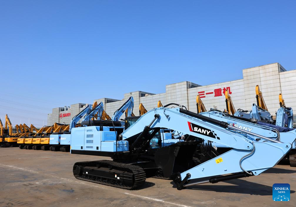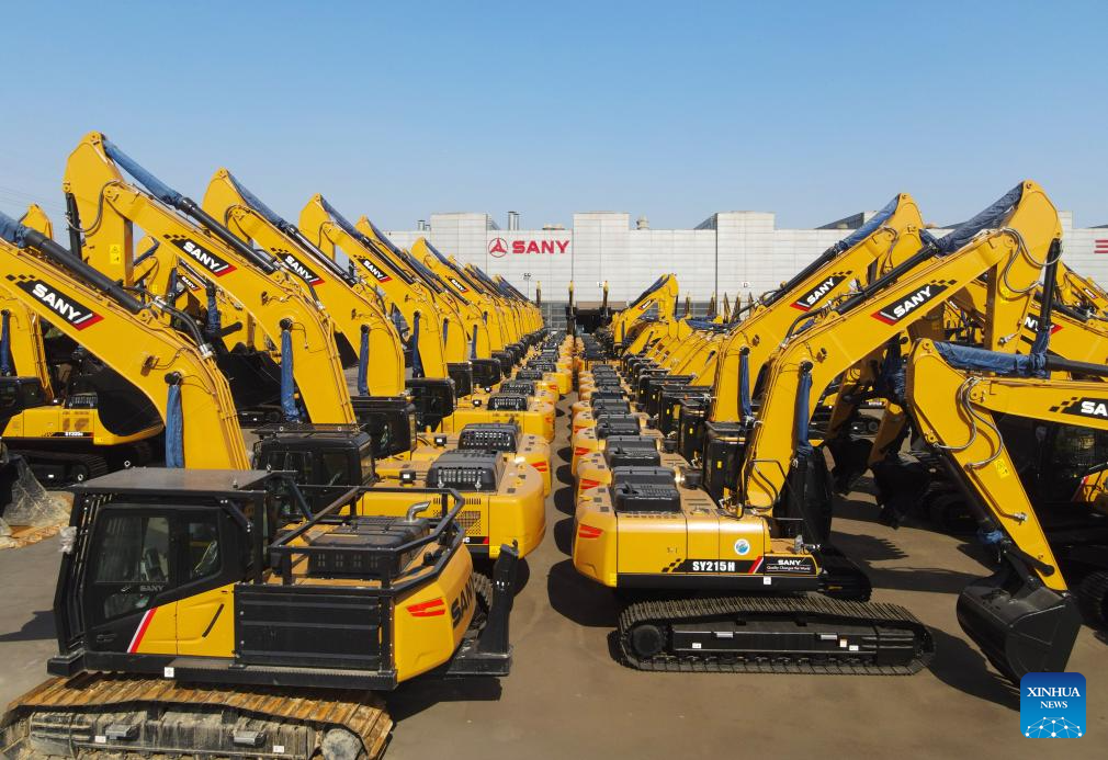 This photo taken on April 15, 2025 shows excavators for export at Shanghai Sany Heavy Machinery Co., LTD. in Shanghai, east China, April 15, 2025. (Xinhua/Fang Zhe)