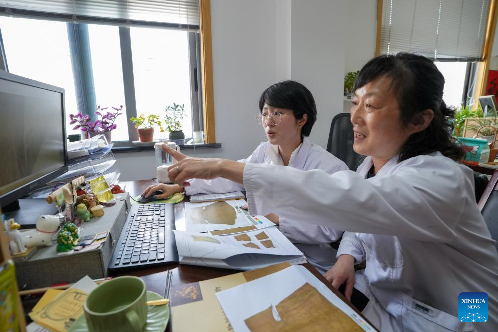 Suzhou Silk Museum staff members Chen Yanlu (L) and Meng Xiaochou discuss restoration plan for cultural relics in Suzhou, east China's Jiangsu Province, May 18, 2025. (Xinhua/Li Bo)