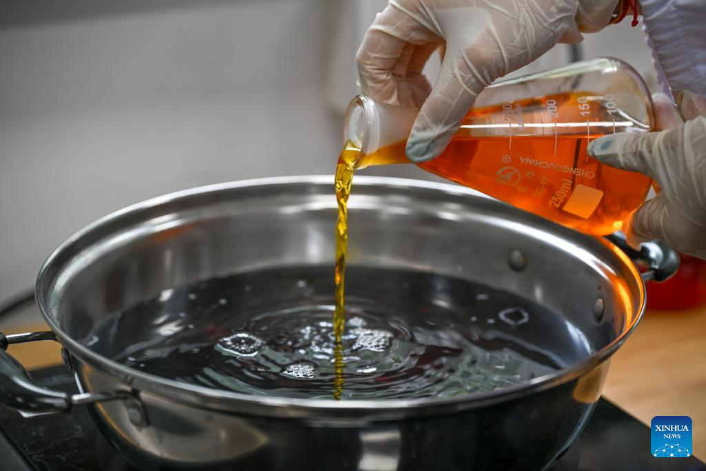 Suzhou Silk Museum staff member Chen Yanlu prepares dyes for silk garment restoration in Suzhou, east China's Jiangsu Province, May 18, 2025. (Xinhua/Chen Shuo)