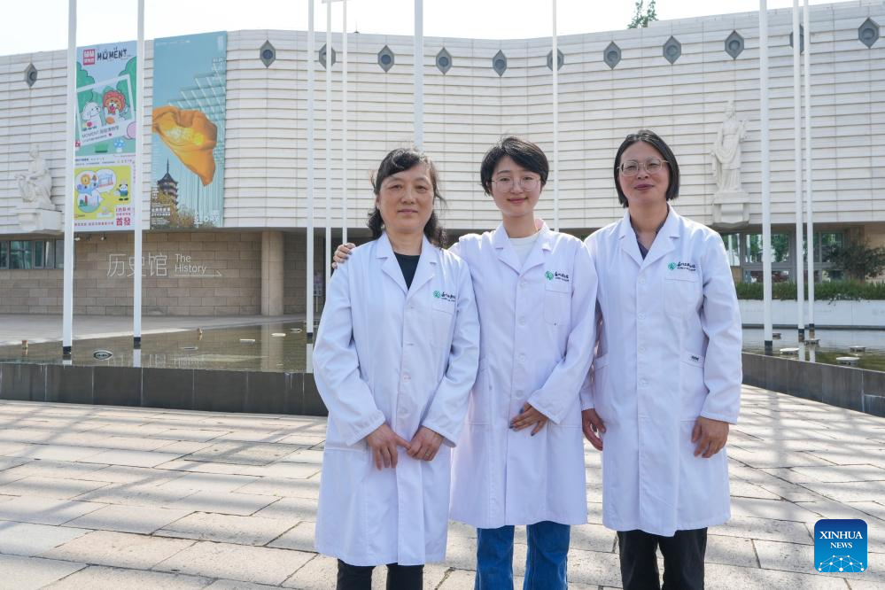 Suzhou Silk Museum staff member Chen Yanlu (C) and her team members Meng Xiaochou (L) and Zhang Guohua pose for a group photo in Suzhou, east China's Jiangsu Province, May 19, 2025. (Xinhua/Li Bo)