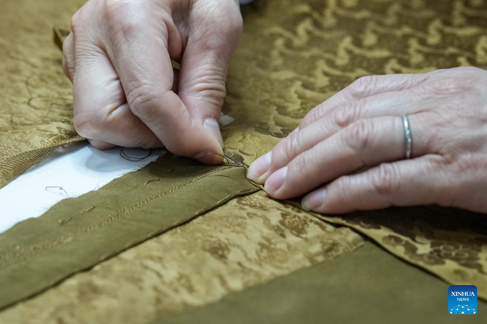 Suzhou Silk Museum staff member Meng Xiaochou restores a silk garment at Suzhou Silk Museum in Suzhou, east China's Jiangsu Province, May 18, 2025. (Xinhua/Li Bo)