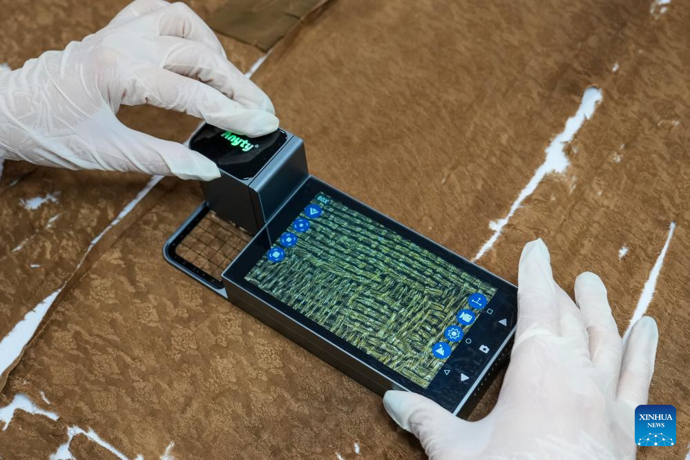 Suzhou Silk Museum staff member Chen Yanlu uses a portable microscope to analyze fabrics in Suzhou, east China's Jiangsu Province, May 18, 2025. (Xinhua/Li Bo)