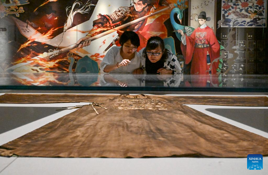 Suzhou Silk Museum staff members Chen Yanlu (L) and Meng Xiaochou arrange a silk garment dating back to the Ming Dynasty (1368-1644) in Suzhou, east China's Jiangsu Province, May 18, 2025. Restoration of this cultural relic has been ongoing for more than three months.