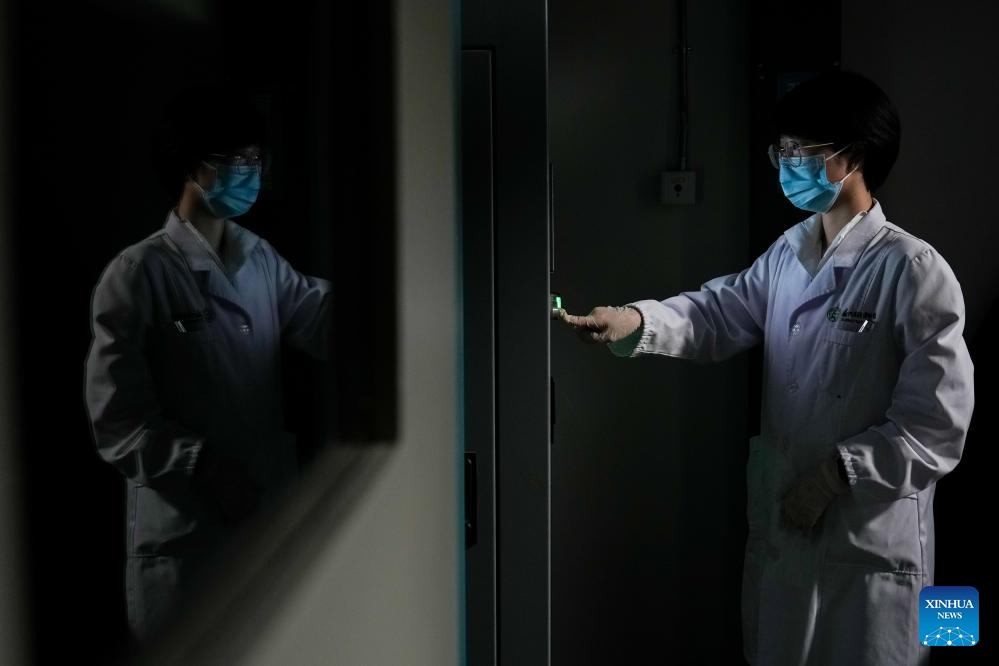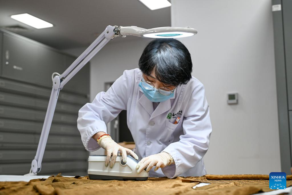 Suzhou Silk Museum staff member Chen Yanlu tests the color of a cultural relic in Suzhou, east China's Jiangsu Province, May 18, 2025. (Xinhua/Chen Shuo)