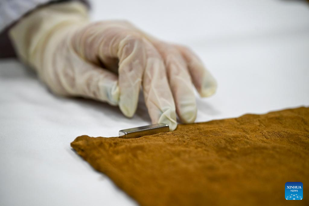 Suzhou Silk Museum staff member Chen Yanlu dyes a piece of material for restoring cultural relic in Suzhou, east China's Jiangsu Province, May 18, 2025. (Xinhua/Li Bo)
