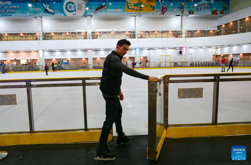 Indonesia's professional ice dancer Dwiki Eka Ramadhan prepares for a figure skating training session on an ice rink in Jakarta, Indonesia, May 14, 2025. (Xinhua/Zulkarnain)