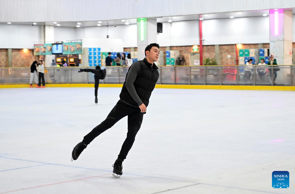 Dwiki Eka Ramadhan attends a figure skating training session on an ice rink in Jakarta, Indonesia, May 14, 2025. (Xinhua/Zulkarnain)