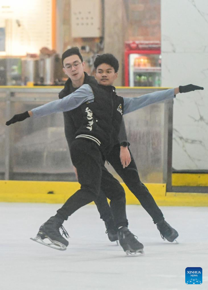 Dwiki Eka Ramadhan (L) trains one of his students Rafif Herfianto Putra figure skating on an ice rink in Jakarta, Indonesia, May 14, 2025. (Xinhua/Zulkarnain)