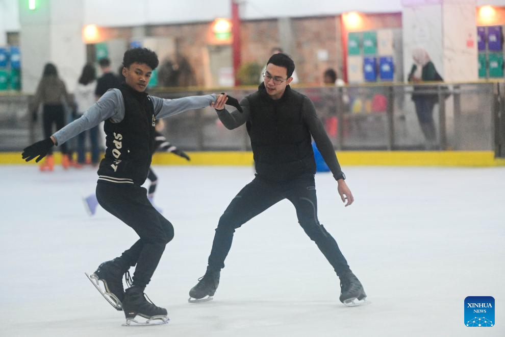 Dwiki Eka Ramadhan (R) trains one of his students Rafif Herfianto Putra figure skating on an ice rink in Jakarta, Indonesia, May 14, 2025. (Xinhua/Zulkarnain)