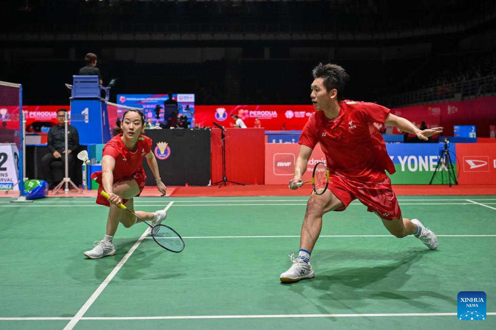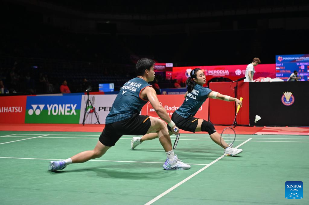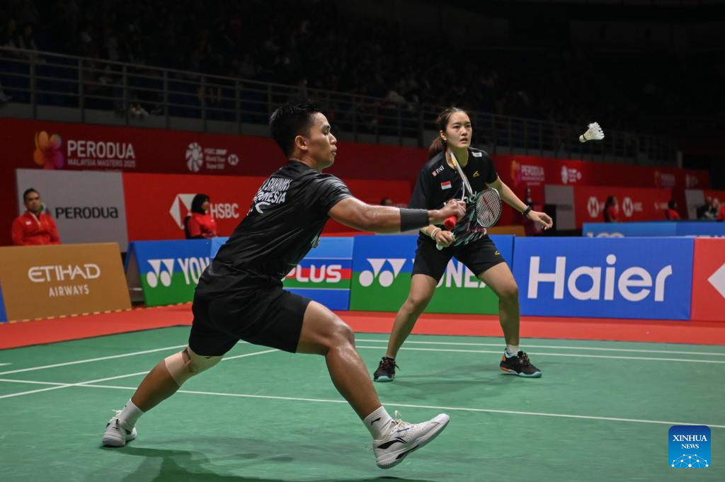 Verrell Yustin Mulia/Lisa Ayu Kusumawati (R) of Indonesia compete during the mixed doubles round of 16 match against Cheng Xing/Zhang Chi of China at 2025 Malaysia Masters badminton tournament in Kuala Lumpur, Malaysia, May 22, 2025. (Photo by Chong Voon Chung/Xinhua)