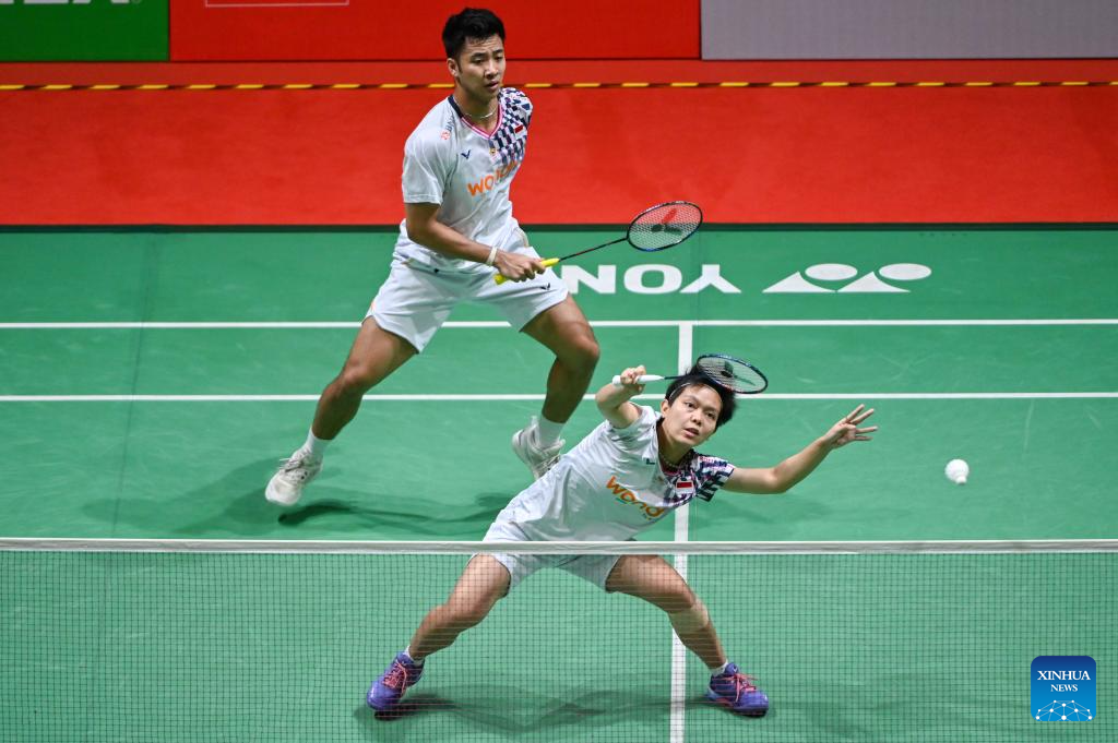 Ratchapol Makkasasithorn/Nattamon Laisuan (L) of Thailand compete during the mixed doubles round of 16 match against Jiang Zhenbang/Wei Yaxin of China at 2025 Malaysia Masters badminton tournament in Kuala Lumpur, Malaysia, May 22, 2025. (Photo by Chong Voon Chung/Xinhua)