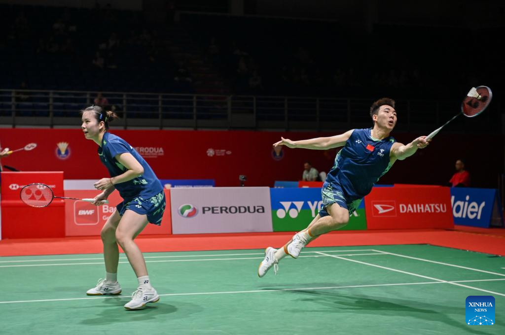 Cheng Xing (R)/Zhang Chi of China compete during the mixed doubles round of 16 match against Verrell Yustin Mulia/Lisa Ayu Kusumawati of Indonesia at 2025 Malaysia Masters badminton tournament in Kuala Lumpur, Malaysia, May 22, 2025. (Photo by Chong Voon Chung/Xinhua)