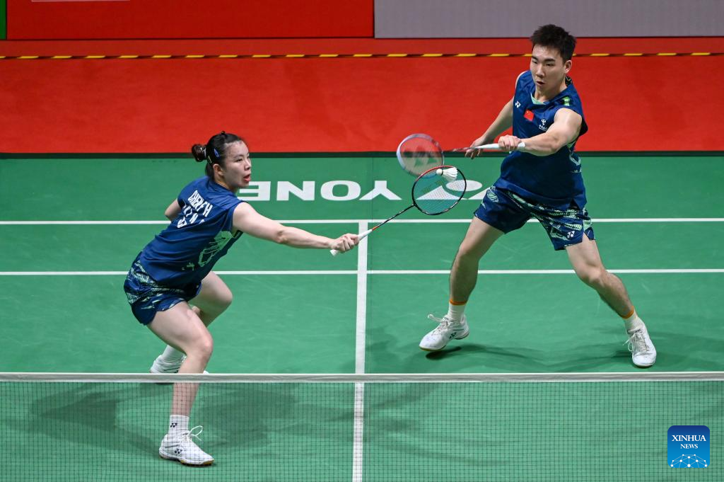 Jiang Zhenbang/Wei Yaxin (R) of China compete during the mixed doubles round of 16 match against Ratchapol Makkasasithorn/Nattamon Laisuan of Thailand at 2025 Malaysia Masters badminton tournament in Kuala Lumpur, Malaysia, May 22, 2025. (Photo by Chong Voon Chung/Xinhua)