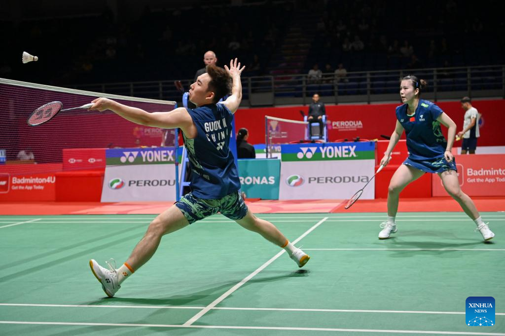 Guo Xinwa (R)/Chen Fanghui of China compete during the mixed doubles round of 16 match against Dejan Ferdinansyah/Siti Fadia Silva Ramadhanti of Indonesia at 2025 Malaysia Masters badminton tournament in Kuala Lumpur, Malaysia, May 22, 2025. (Photo by Chong Voon Chung/Xinhua)