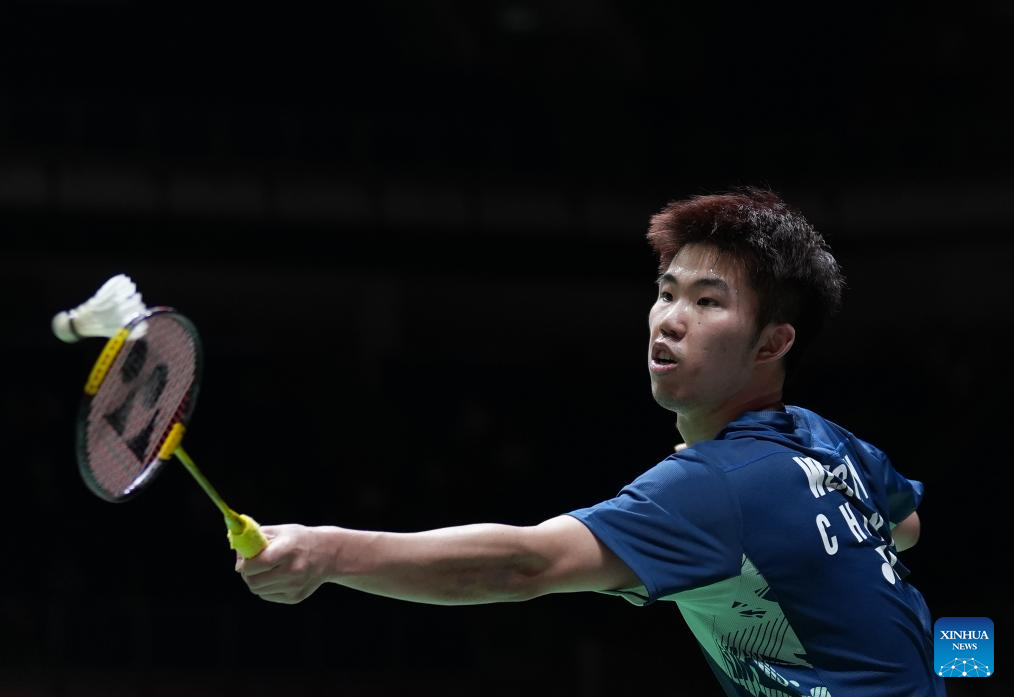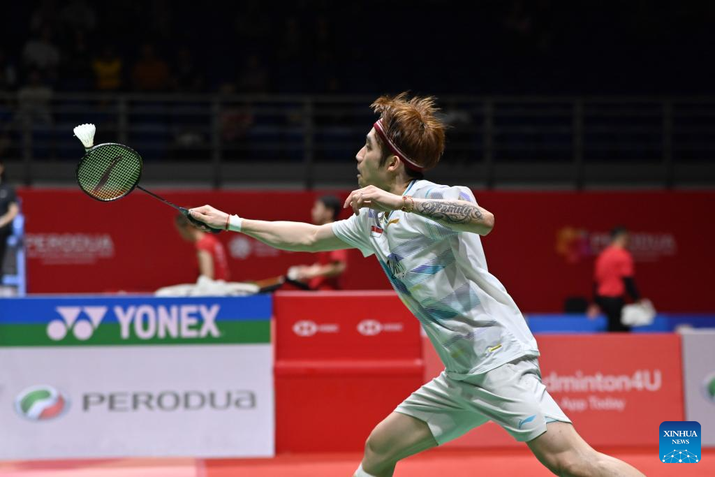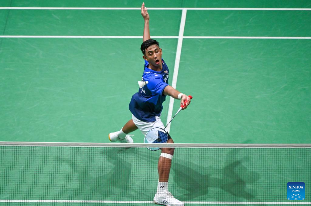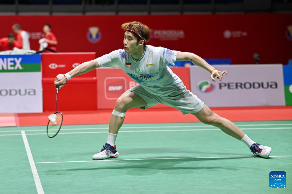 Jia Heng Jason Teh of Singapore hits a return during the men's singles round of 16 match against Li Shifeng of China at 2025 Malaysia Masters badminton tournament in Kuala Lumpur, Malaysia, May 22, 2025. (Photo by Chong Voon Chung/Xinhua)