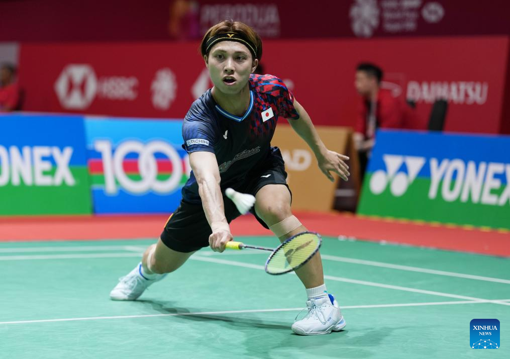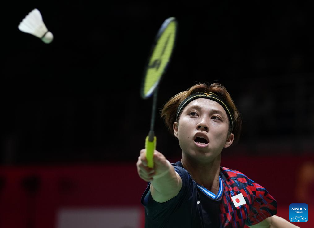 Naraoka Kodai of Japan hits a return during the men's singles round of 16 match against Chico Aura Dwi Wardoyo of Indonesia at 2025 Malaysia Masters badminton tournament in Kuala Lumpur, Malaysia, May 22, 2025. (Xinhua/Jia Haocheng)