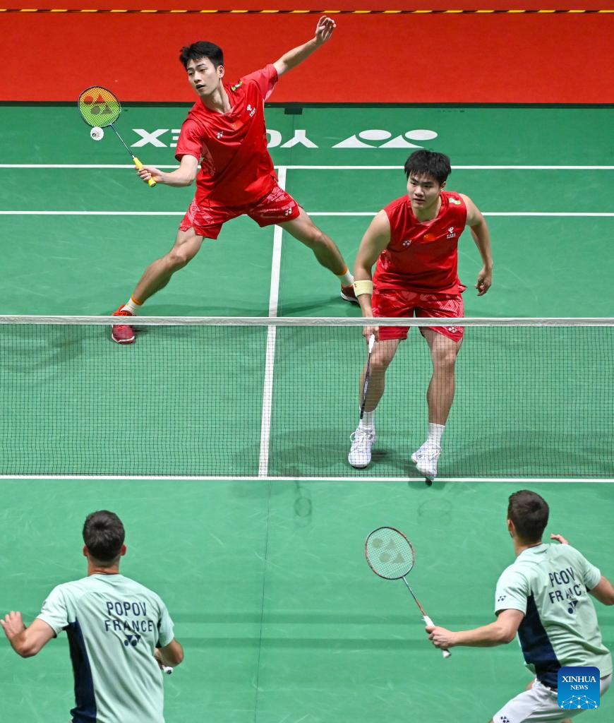 (250522) -- KUALA LUMPUR, May 22, 2025 (Xinhua) -- Liang Weikeng (top R)/Wang Chang (top L) of China compete against Christo Popov/Toma Junior Popov of France during the men's doubles round of 16 match at 2025 Malaysia Masters badminton tournament in Kuala Lumpur, Malaysia, May 22, 2025. (Photo by Chong Voon Chung/Xinhua)