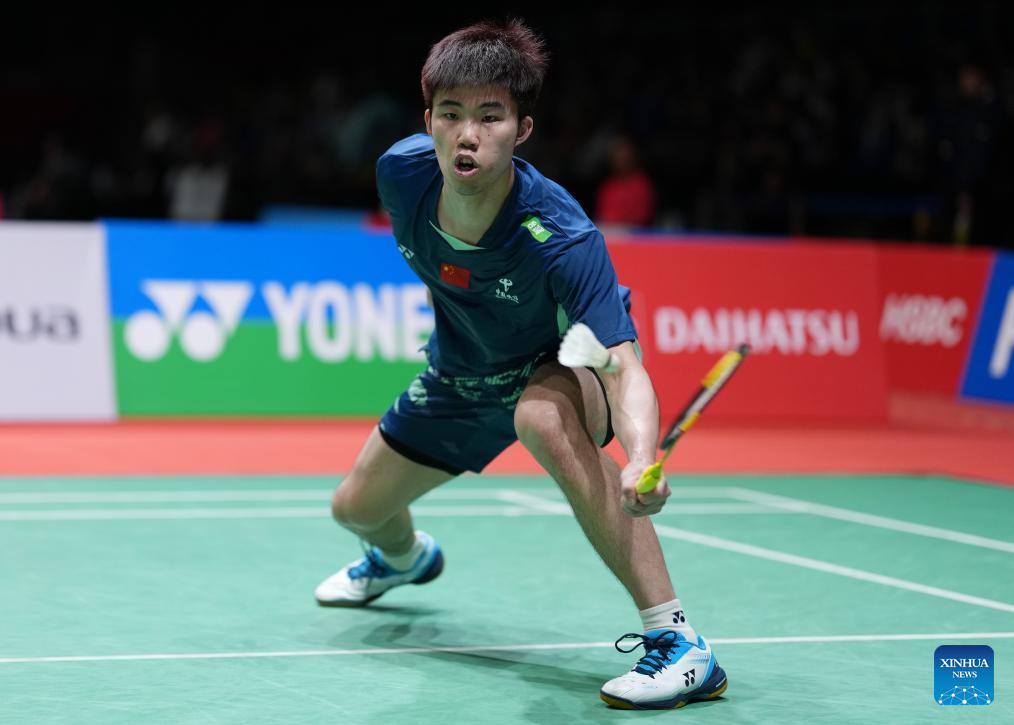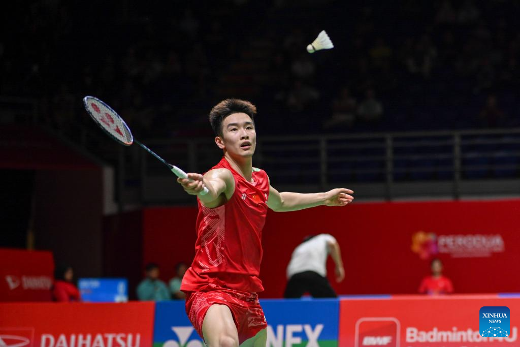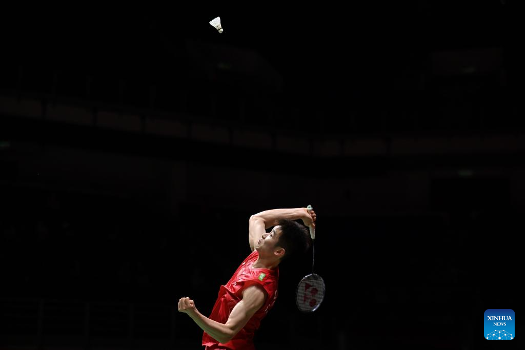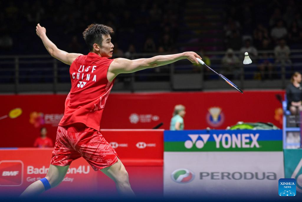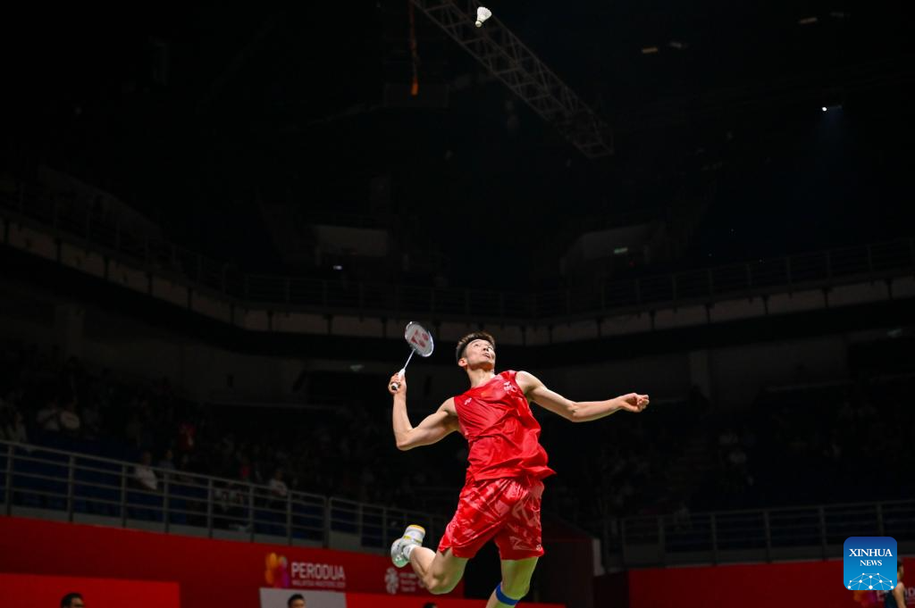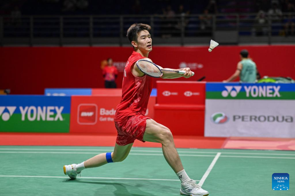 Li Shifeng of China hits a return during the men's singles round of 16 match against Jia Heng Jason Teh of Singapore at 2025 Malaysia Masters badminton tournament in Kuala Lumpur, Malaysia, May 22, 2025. (Photo by Chong Voon Chung/Xinhua)