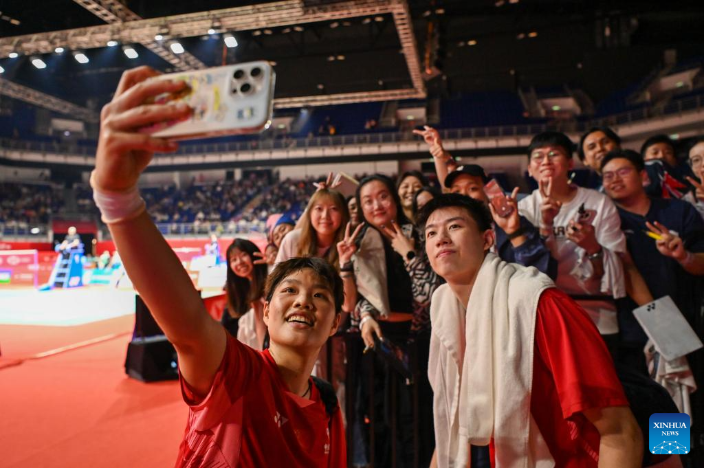 Feng Yanzhe (front R)/Huang Dongping (front L) of China take a selfie with fans after the mixed doubles round of 16 match against Amri Syahnawi/Nita Violina Marwah of Indonesia at 2025 Malaysia Masters badminton tournament in Kuala Lumpur, Malaysia, May 22, 2025. (Photo by Chong Voon Chung/Xinhua)