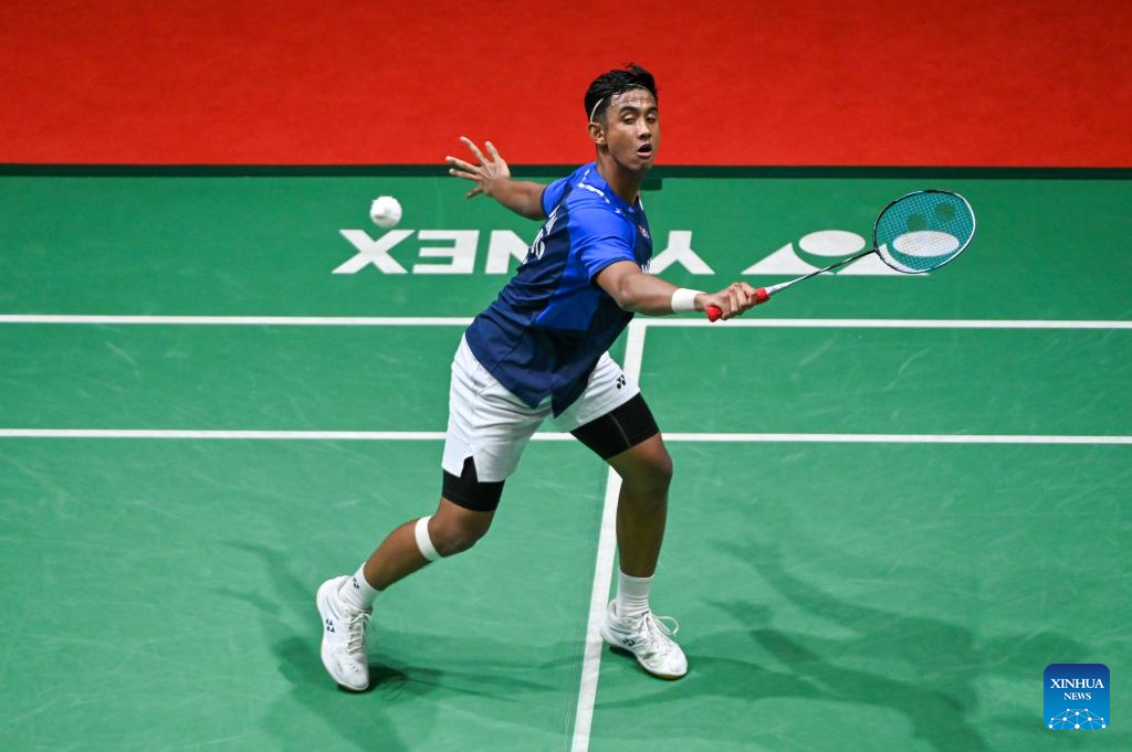 Alwi Farhan of Indonesia hits a return during the men's singles round of 16 match against Weng Hongyang of China at 2025 Malaysia Masters badminton tournament in Kuala Lumpur, Malaysia, May 22, 2025. (Photo by Chong Voon Chung/Xinhua)
