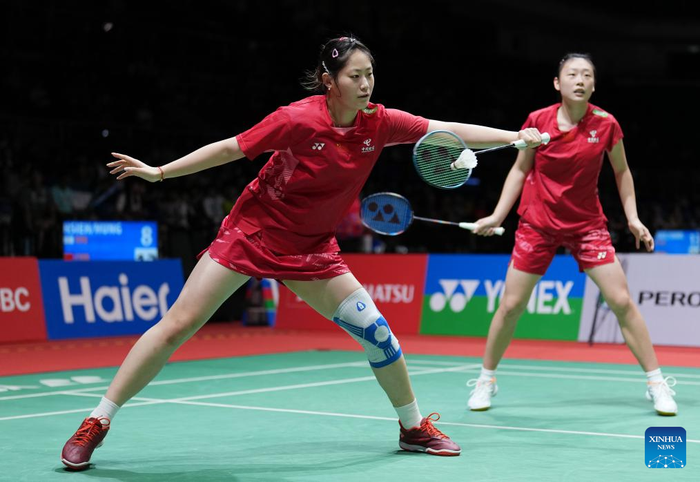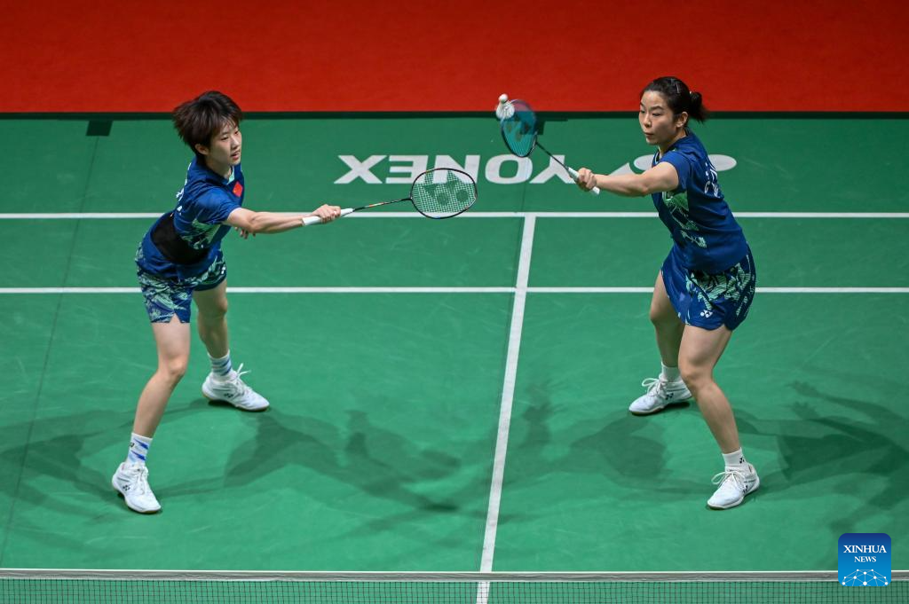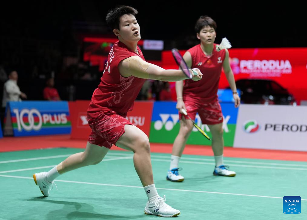Jia Yifan (R)/Zhang Shuxian of China compete during the women's doubles round of 16 match against Go Pei Kee/Teoh Mei Xing of Malaysia at 2025 Malaysia Masters badminton tournament in Kuala Lumpur, Malaysia, May 22, 2025. (Photo by Chong Voon Chung/Xinhua)