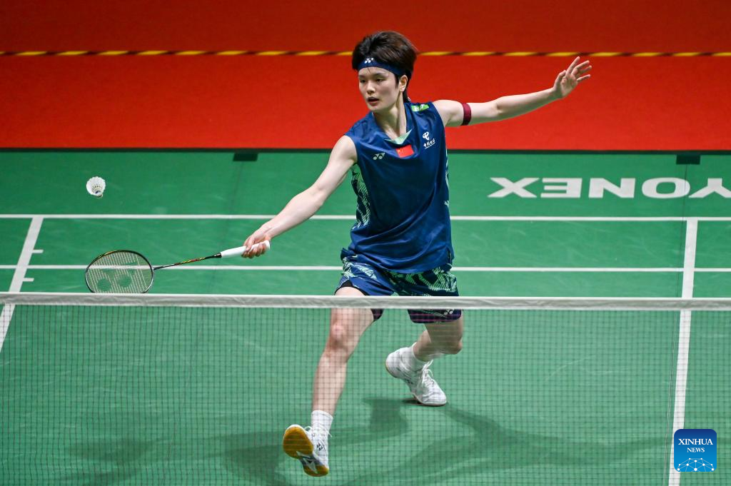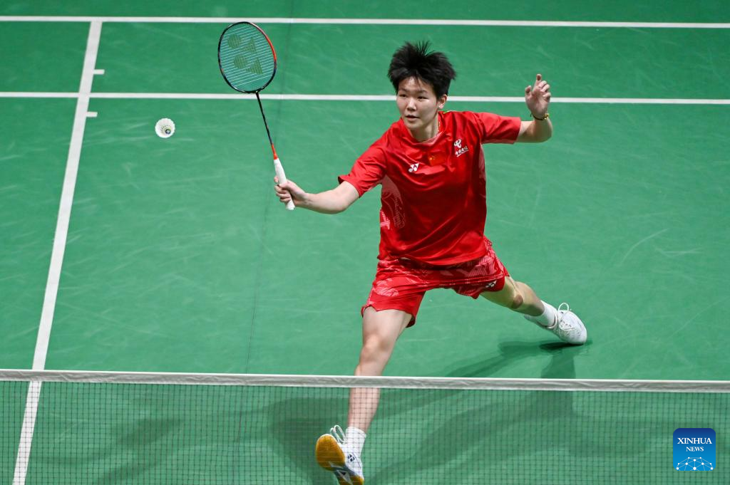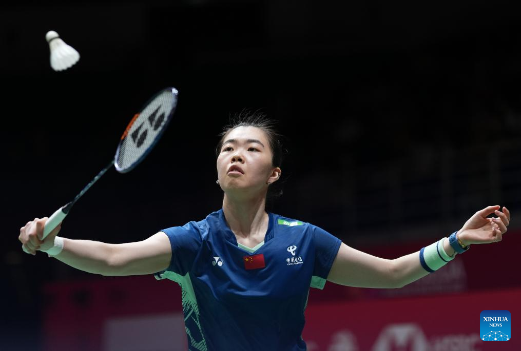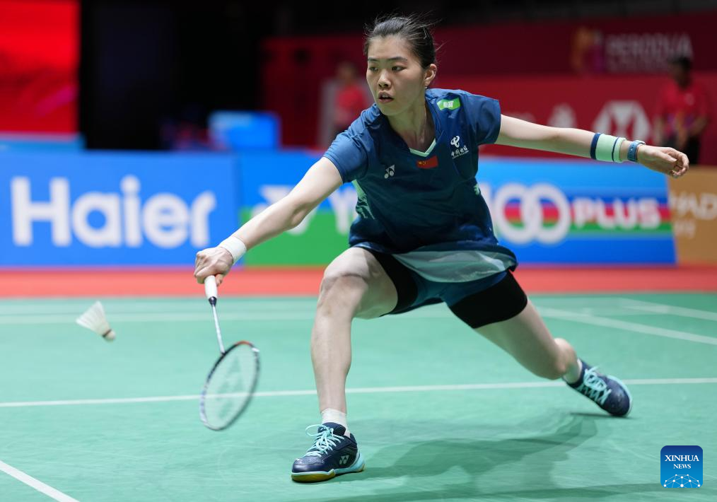 Wang Zhiyi of China hits a return during the women's singles round of 16 match against Han Qianxi of China at 2025 Malaysia Masters badminton tournament in Kuala Lumpur, Malaysia, May 22, 2025. (Photo by Chong Voon Chung/Xinhua)