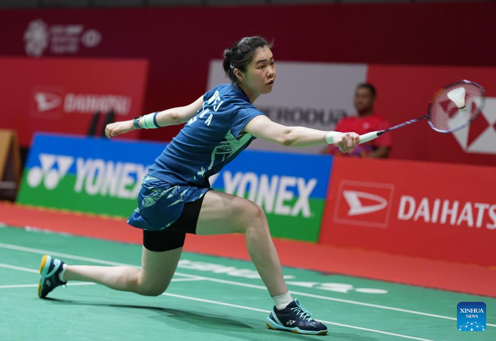 (250522) -- KUALA LUMPUR, May 22, 2025 (Xinhua) -- Chiu Pin-Chian hits a return during the women's singles round of 16 match between Han Yue of China and Chiu Pin-Chian of Chinese Taipei at 2025 Malaysia Masters badminton tournament in Kuala Lumpur, Malaysia, May 22, 2025. (Xinhua/Jia Haocheng)