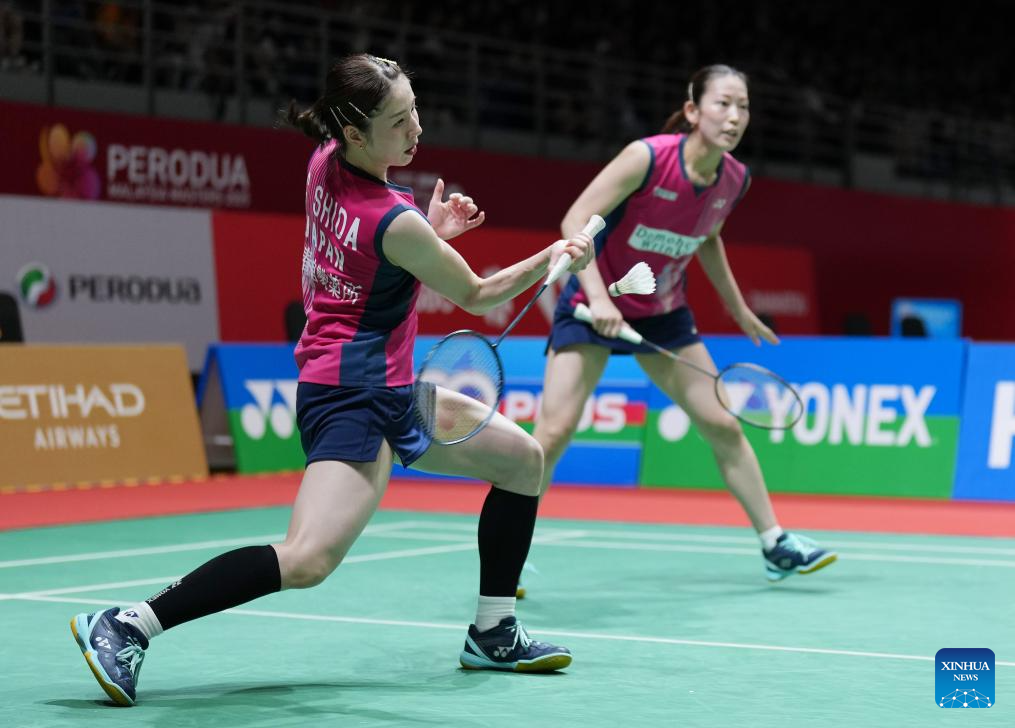 (250522) -- KUALA LUMPUR, May 22, 2025 (Xinhua) -- Matsuyama Nami/Shida Chiharu (Front) compete during the women's doubles round of 16 match between Matsuyama Nami/Shida Chiharu of Japan and Lanny Tria Mayasari/Siti Fadia Silva Ramadhanti of Indonesia at 2025 Malaysia Masters badminton tournament in Kuala Lumpur, Malaysia, May 22, 2025. (Xinhua/Jia Haocheng)