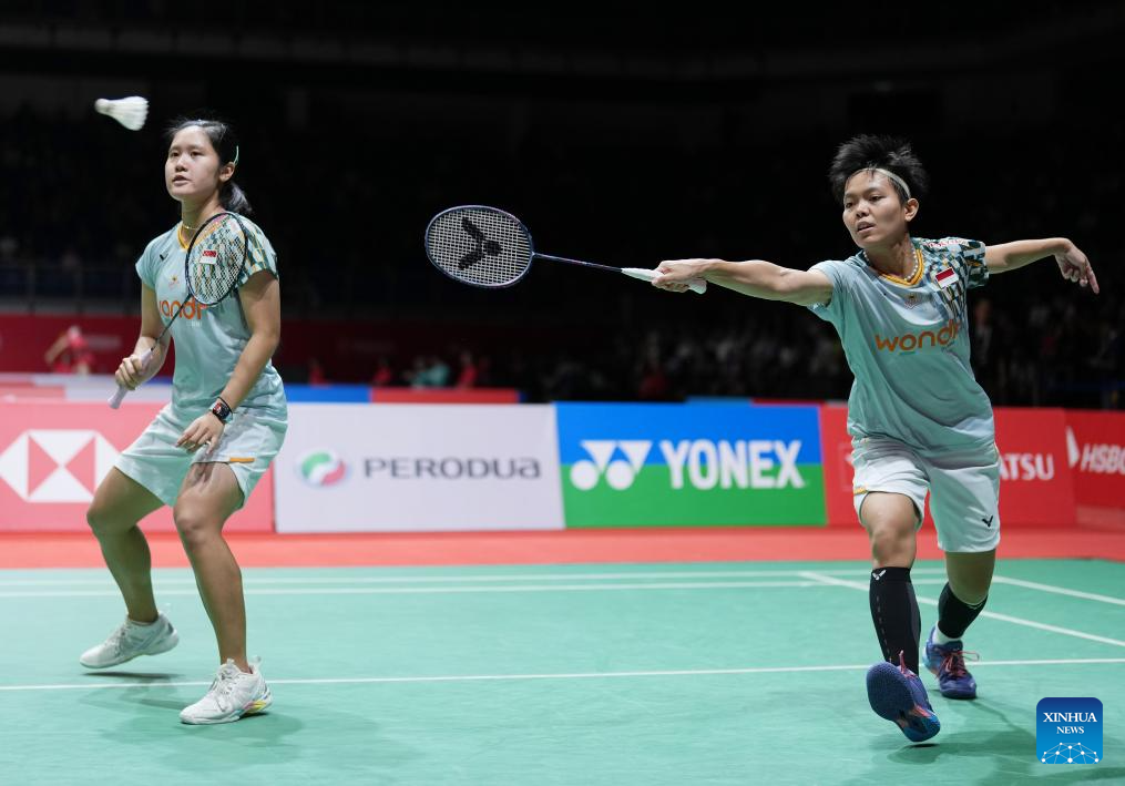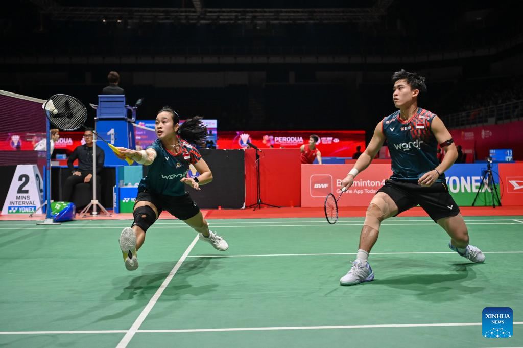 Dejan Ferdinansyah/Siti Fadia Silva Ramadhanti (front) of Indonesia compete during the mixed doubles round of 16 match against Guo Xinwa/Chen Fanghui of China at 2025 Malaysia Masters badminton tournament in Kuala Lumpur, Malaysia, May 22, 2025. (Photo by Chong Voon Chung/Xinhua)
