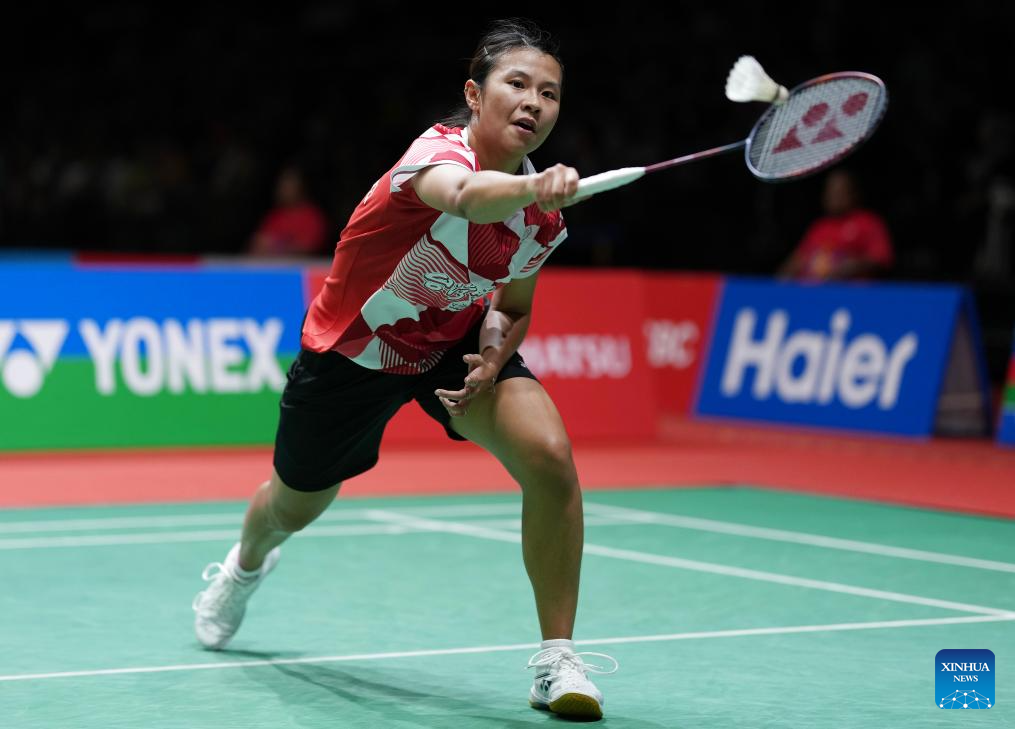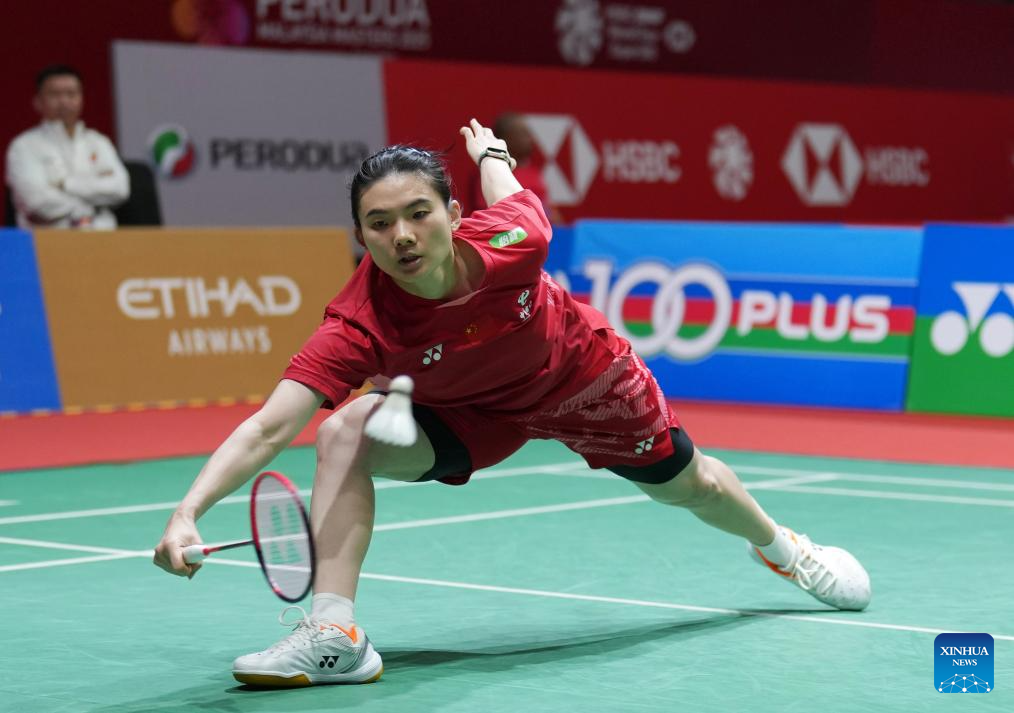 Gao Fangjie of China hits a return during the women's singles round of 16 match against Lin Hsiang Ti of Chinese Taipei at 2025 Malaysia Masters badminton tournament in Kuala Lumpur, Malaysia, May 22, 2025. (Xinhua/Jia Haocheng)