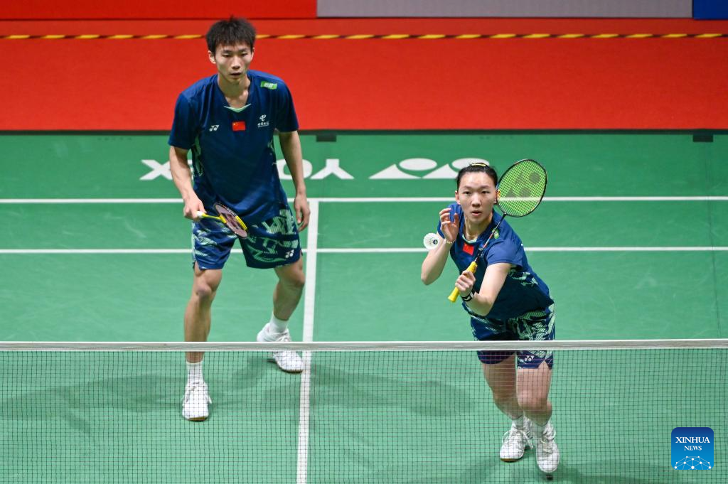 Guo Xinwa/Chen Fanghui (L) of China compete during the mixed doubles round of 16 match against Dejan Ferdinansyah/Siti Fadia Silva Ramadhanti of Indonesia at 2025 Malaysia Masters badminton tournament in Kuala Lumpur, Malaysia, May 22, 2025. (Photo by Chong Voon Chung/Xinhua)