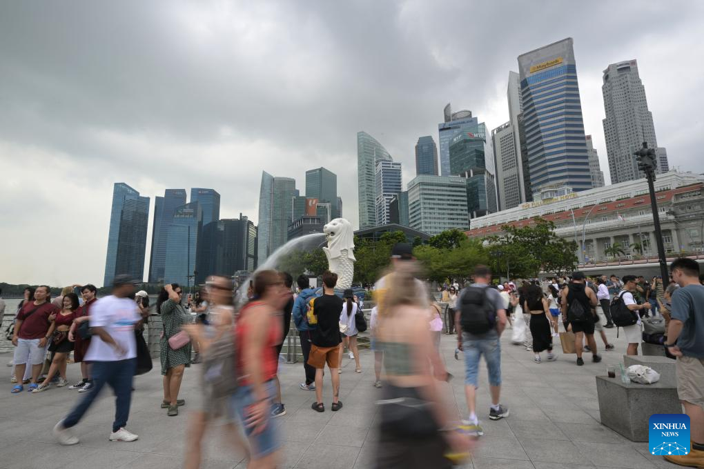 Tourists visit Singapore's Marina Bay area on May 22, 2025. Singapore's economy expanded 3.9 percent in the first quarter from a year earlier, easing from 5.0 percent growth in the previous quarter, official data showed on Thursday. (Photo by Then Chih Wey/Xinhua)