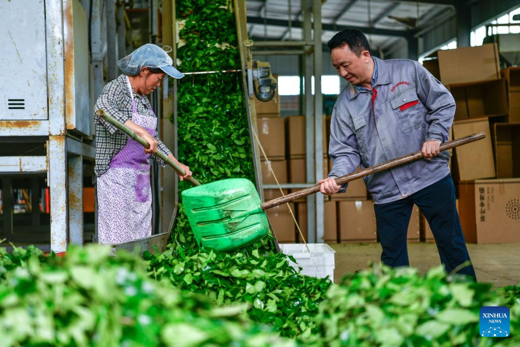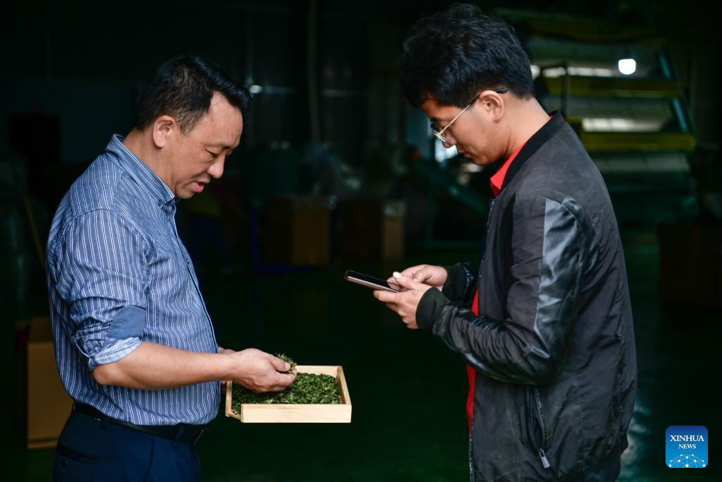 Wei Yong (L) checks the condition of raw materials for matcha production at a tea processing factory in Jiangkou County, southwest China's Guizhou Province, May 15, 2025.