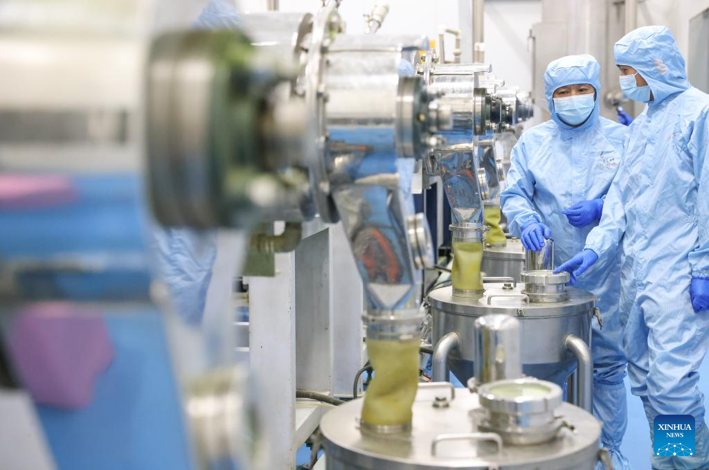 Wei Yong checks the condition of a matcha production line inside a workshop in Jiangkou County, southwest China's Guizhou Province, May 14, 2025.
