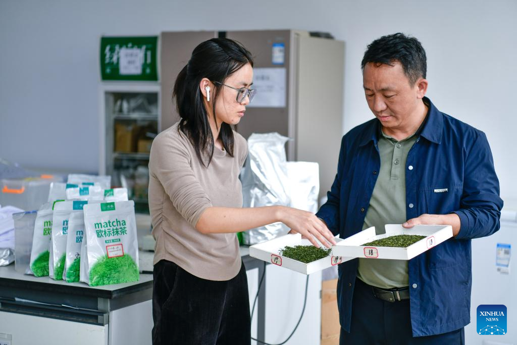 Wei Yong (L) tests a matcha sample with a colleague in Jiangkou County, southwest China's Guizhou Province, May 14, 2025.