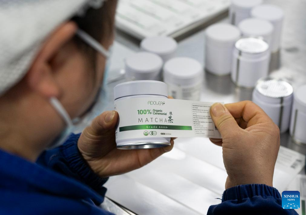 A worker labels a matcha product inside a workshop in Jiangkou County, southwest China's Guizhou Province, May 14, 2025.